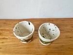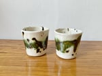 White stoneware cups glazed with copper and iron oxides and a clear gloss.